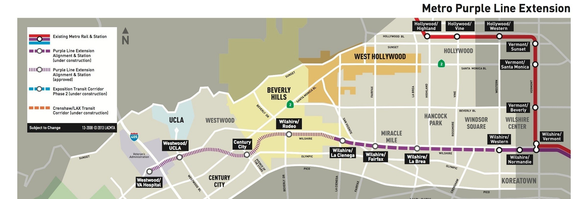 The Purple Line will provide rapid, heavy-rail service beneath most of Wilshire Boulevard from its current terminus at Western Avenue all the way to the VA Hospital west of the 405 Freeway. Once complete, this project will provide a 25-minute ride between Downtown Los Angeles and Westwood. It will provide a vital alternative to the heavy congestion travelers face on the 10 Freeway and throughout the Wilshire corridor.